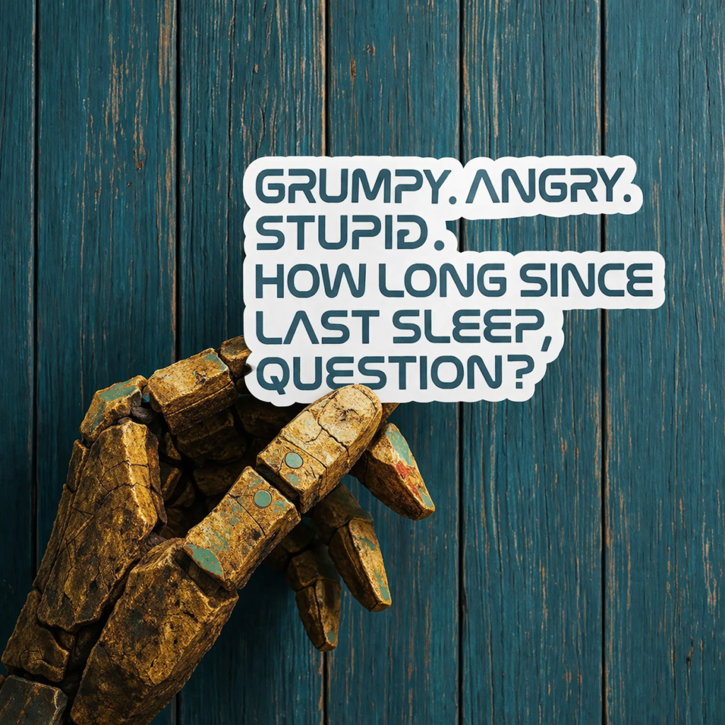 “Grumpy. Angry. Stupid. How long since last sleep, question?”